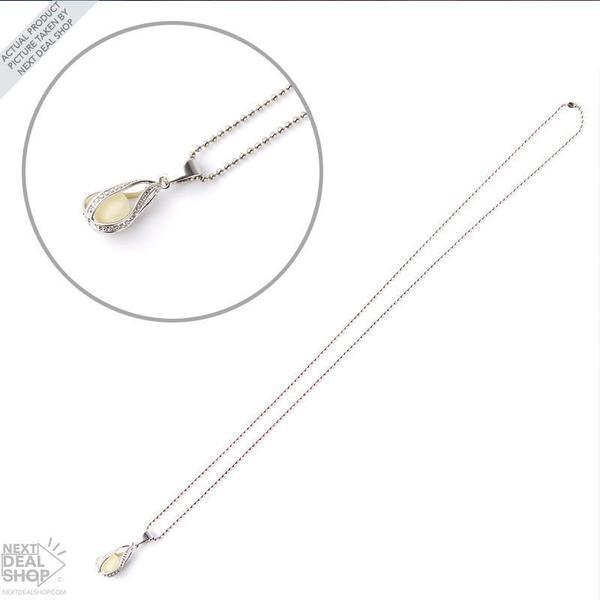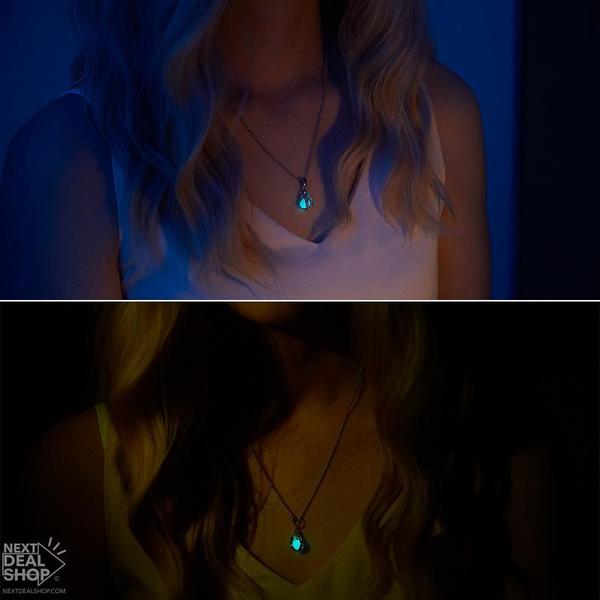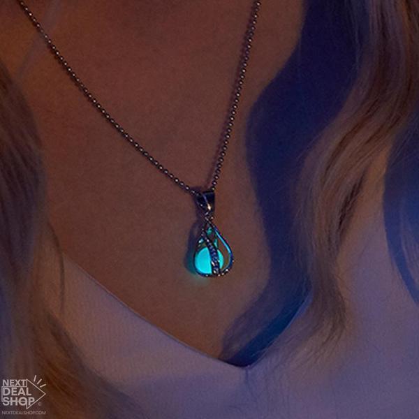 Colar belamente trabalhado com uma pedra que brilha no escuro dentro de um pingente cortado.